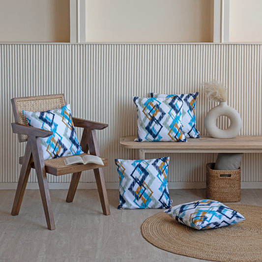 With our ikat print cushion covers, you can add a touch of ethnicity and international charm to your house. Ikat prints, distinguished by their distinctive dyeing method and vivid designs, honour tradition while incorporating a dash of bohemian style. These cushion covers are ideal for home themes that are eclectic, rustic, or culturally inspired. The most selling one in this range is the yellow Ikat print cushion cover.