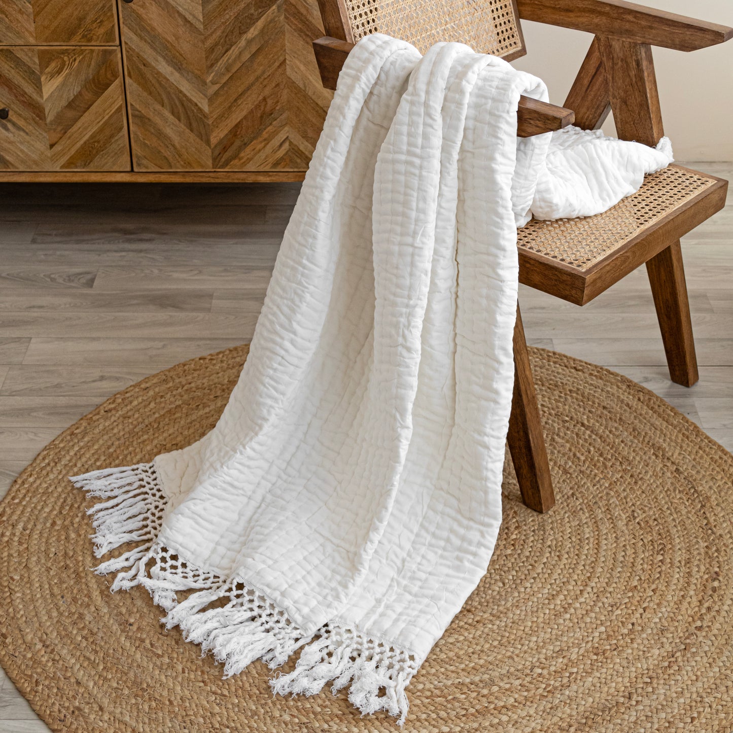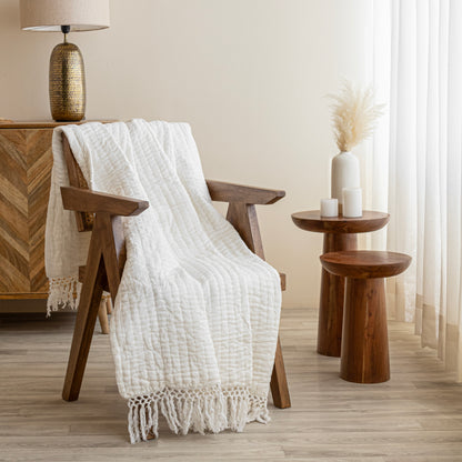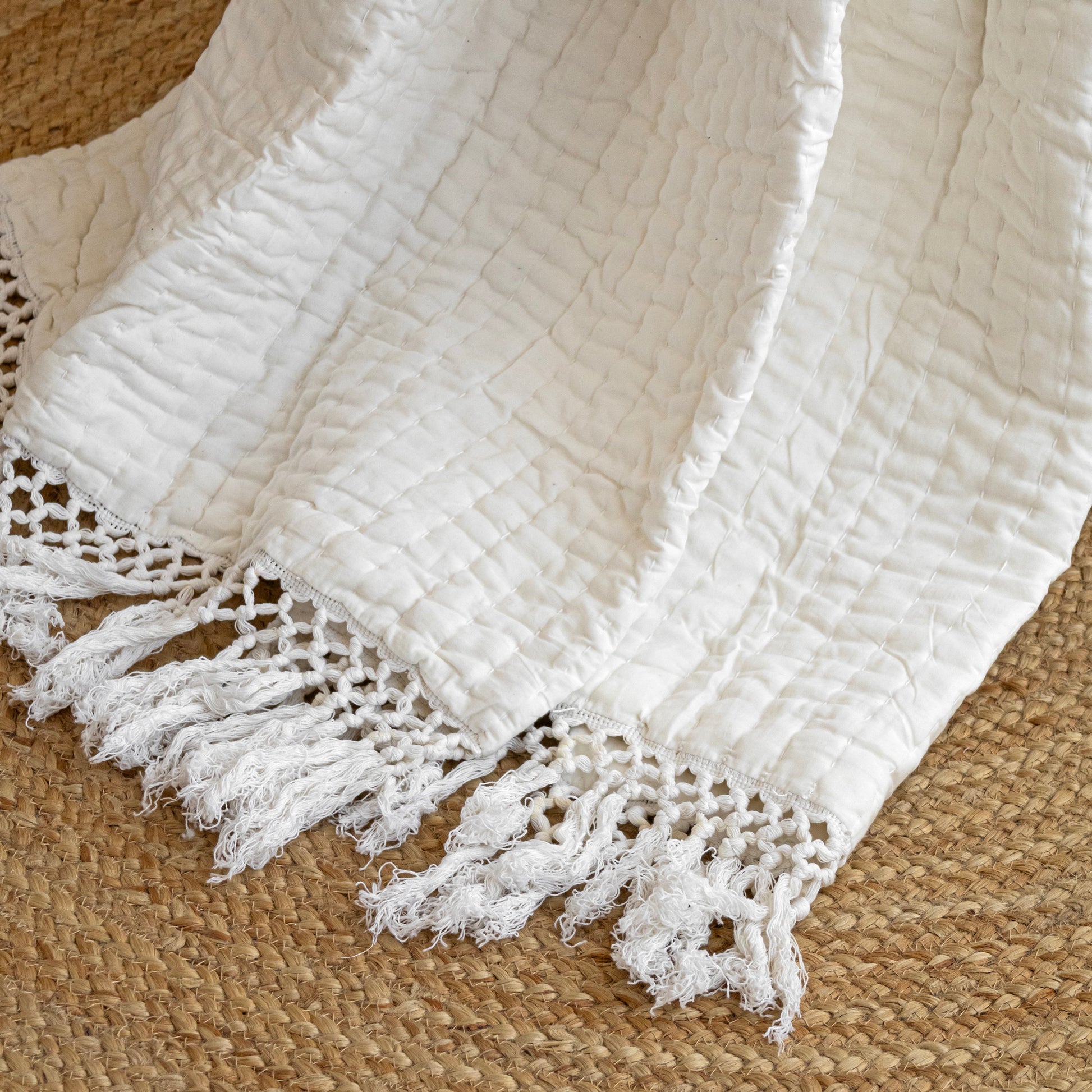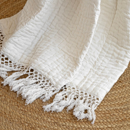 Introducing the Fort White Throw – a captivating blend of elegance and craftsmanship for your home decor. Hand-stitched with care by skilled Indian artisans, this throw boasts the intricate beauty of Kantha embroidery, adding a touch of cultural charm to any space. Crafted from 100% cotton, it offers both softness and durability, ensuring lasting comfort and style. Perfectly versatile, this throw is ideal for draping over your living room couch, bed, or sofa, instantly enhancing the ambiance of your space. Whether you're curling up with a book or adding a decorative layer to your furniture, the Fort White Throw is a timeless accent piece. Thoughtful and stylish, it also makes for a memorable gift, bringing warmth and character to any home. Elevate your interior with the Fort White Throw – where tradition meets contemporary elegance for a truly enchanting living experience.
