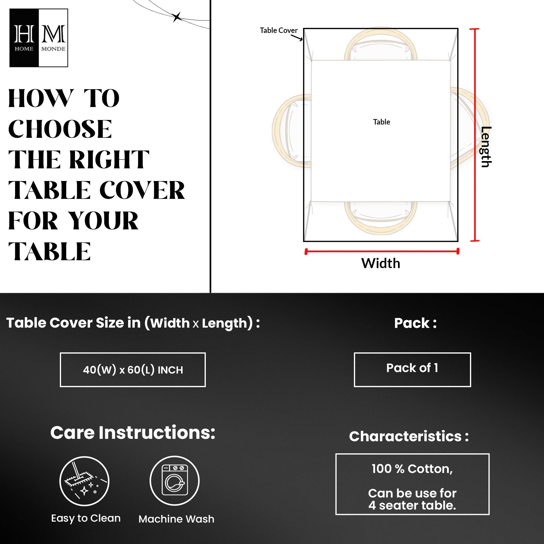 In this order, you get one tablecloth cover made of 100% cotton. The cover comes in dimensions of 40 x 60 inches and is perfect for a 4-seat dining table.
