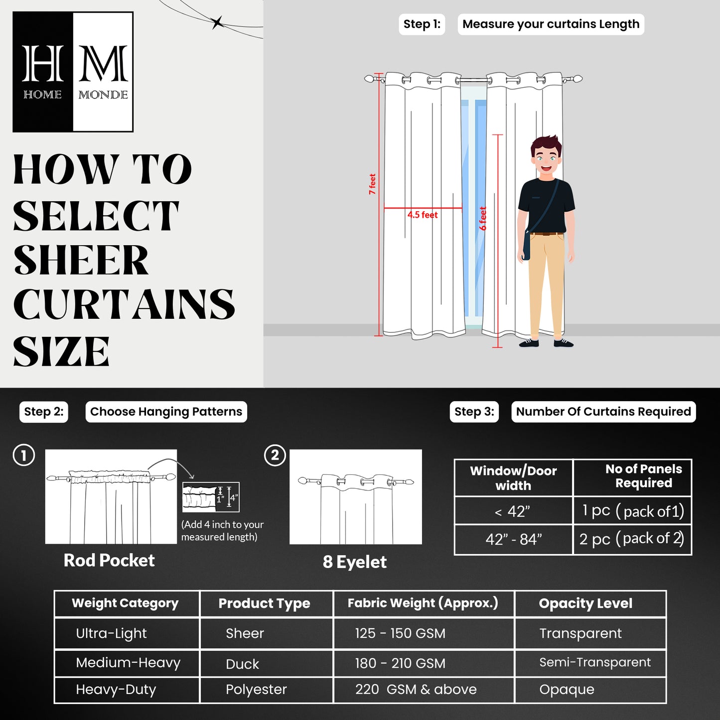 HomeMonde presents a captivating range of sheer curtains online, perfect for bedrooms, living rooms, or offices. Crafted from premium-quality sheer cotton fabric, these cotton sheer curtains let in pleasant sunlight while reducing harsh glare. Choose from a variety of captivating sheer curtain colours, including white, blue, grey, beige, mint green, purple, maroon, yellow, pink, and celeste. Each colour used in Homeowner's sheer curtains cotton, is Azo-free, making it a safe and eco-friendly choice. Wash them in a machine without worrying about the colour fade or fabric impact, as these are thoughtfully designed to last a long time. Have an airy and breathable space with added privacy by choosing sheer curtains for bedrooms, living rooms, and offices from HomeMonde. Explore our premium and colourful collection of sheer curtains online to easily find the perfect choice that makes your space look like you always imagine it in your dreams. Read less