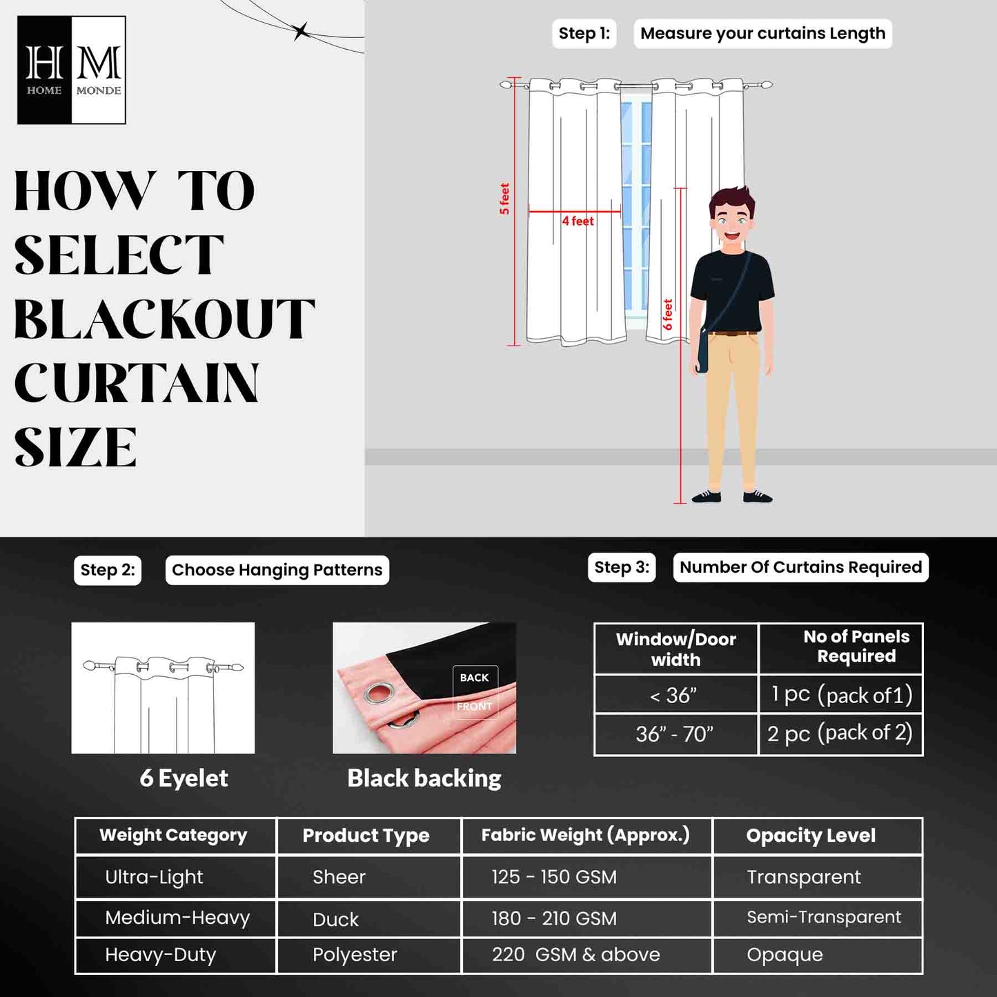 Create maximum darkness in rooms with HomeMonde’s blackout curtains online. The triple-weave blackout material of our curtains can create 90%- 99% blackout. The front is beautiful coloured yarn, and on the back, there’s double high-density black yarn that maximises darkness. Have it for your bedroom, living room, dining room or guest rooms in a colour that best complements the room’s interior. Our triple-weave blackout curtain design is perfect for meeting your privacy needs and reducing noise by 10-20 dB. Being highly dense, they significantly reduce the heat and cold loss in rooms, resulting in reduced electricity bills. Adding to the benefit list, these curtains prevent your furniture and floors from fading by blocking excessive sunlight entering through the doors and windows. Crafted for maximum comfort, HomeMonde’s blackout curtains are machine washable. Enjoy maximum privacy, reduced noise and dark rooms with our easy-to-maintain blackout curtains available in a stunning variety of colours. Read less